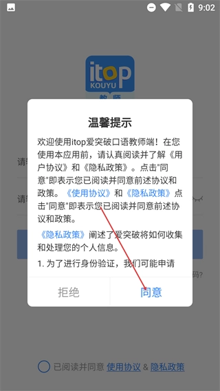 在使用【itop爱突破口语教师端】之前,请仔细阅读《用户协议》与《隐私政策》,点击【同意】按钮后即可继续使用相关服务。