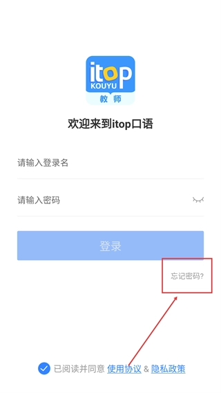 在【itop口语】的登录页面,如果您忘记了密码,可点击登录按钮旁边的【忘记密码?】选项,以此进入密码重置的流程。
