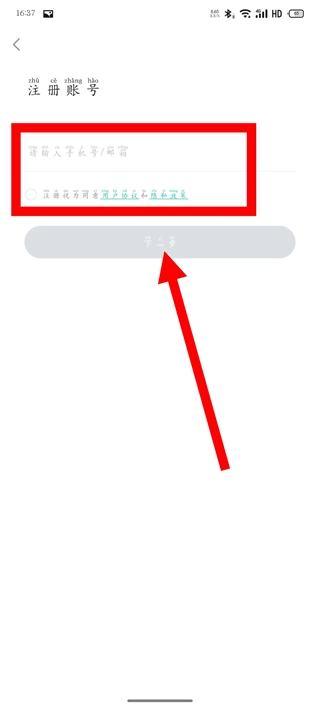 在账号注册页面,先填写手机号,再勾选对应的协议,接着点击下一步按钮。