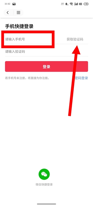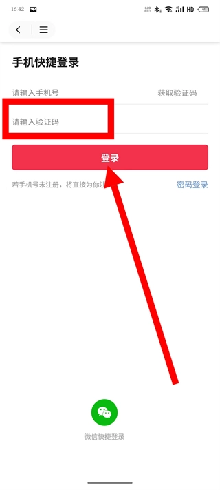 在手机快捷登录界面,填写手机号码后,点击“获取验证码”按钮。