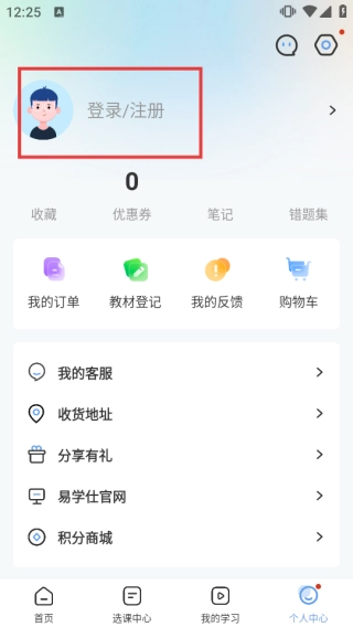 在个人中心页面,点击【登录/注册】按钮,完成账号的登录或注册,这样就能使用更多功能了。