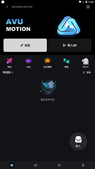 在编辑界面里,能看到qr码、图片/视频、文字、钢笔、模型、画笔、素材广场这些选项,我们可以点击“图片/视频”这个选项来添加图片或者视频,选好想要添加的内容后,点击“导入”按钮就可以完成操作了。