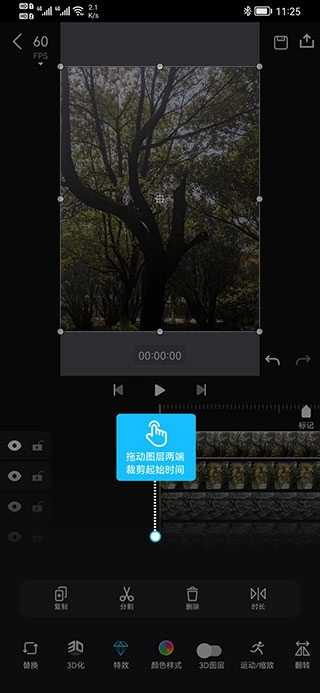 导入操作结束后,拖动图层的两端,调整起始时间进行裁剪。