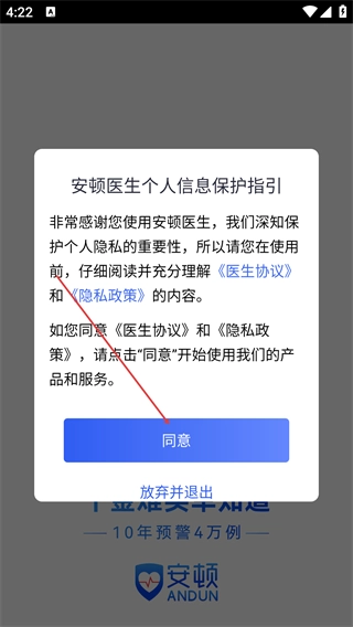 在仔细阅读【安顿医生个人信息保护指引】所包含的《医生协议》与《隐私政策》内容后,点击【同意】按钮,就能正式开启应用流程。