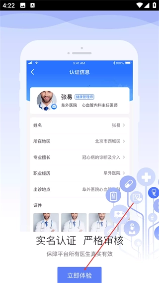 在认证信息引导页面,熟悉平台医生实名认证的相关规则后,点击【立即体验】按钮,即可进入应用的核心功能模块。