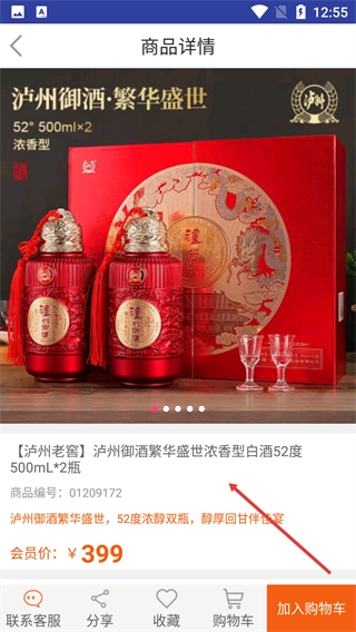 进入【泸州御酒-繁华盛世】的商品详情页面,查看商品参数、会员价等相关信息,以便为后续挑选规格和确定数量做好准备。
