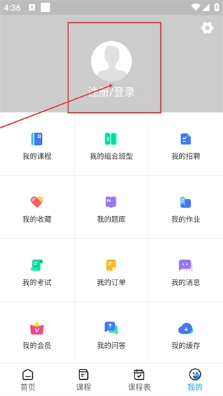 进入“我的”个人中心页面后,点击“注册/登录”入口即可开启账号登录流程;此页面集成了我的课程、我的收藏等个人功能模块。