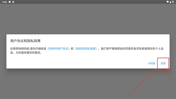 在阅读《快转码用户协议》和《快转码隐私政策》后,点击弹窗里的【同意】按钮,即可继续使用服务。