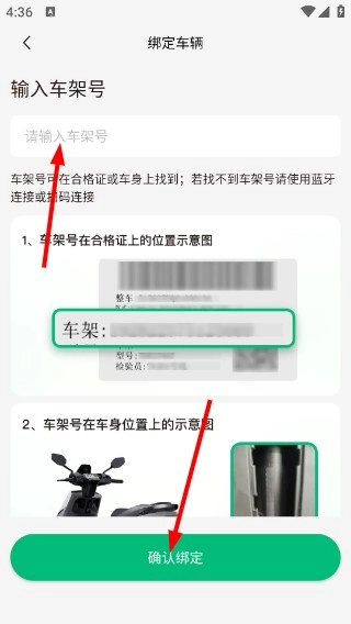 选择【手动输入】的绑定方式后,进入对应页面填写【车架号】,参照示意图找到车架号,再点击【确认绑定】按钮,即可完成整个操作流程。