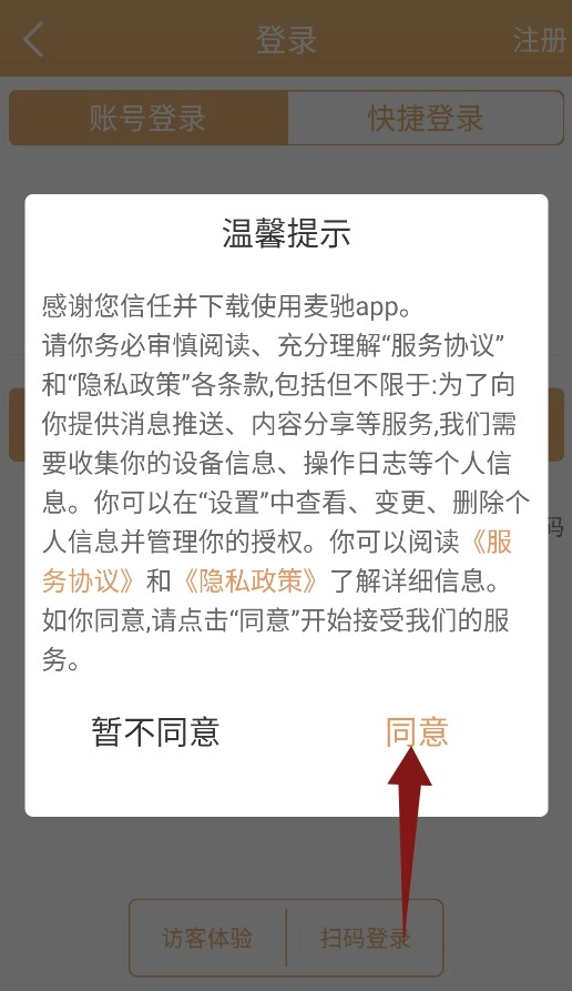 首次打开应用时,需要先点击确认温馨提示,同意相关内容后才能进入登录界面。
