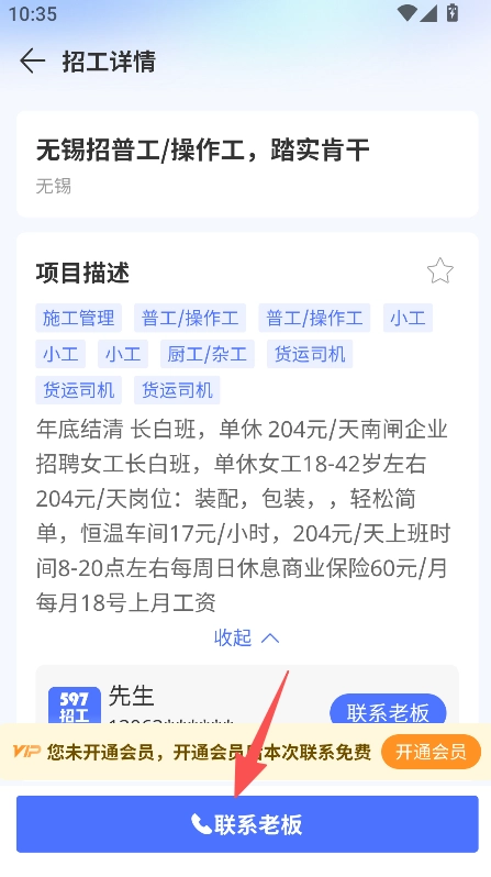 平台设有“联系老板”功能,用户在招工详情页面点击对应的按钮,即可发起与招工方的沟通。