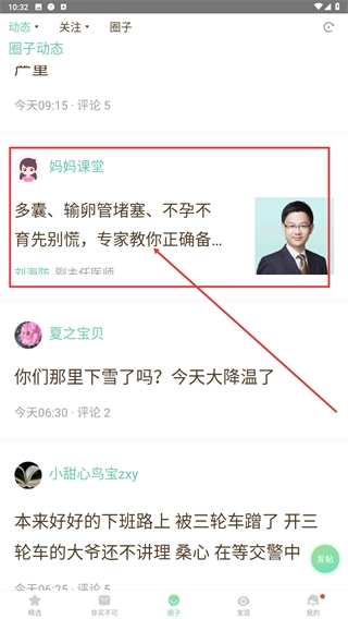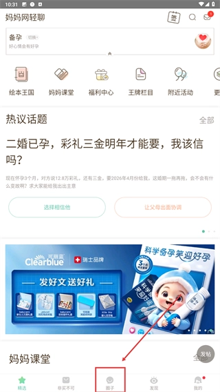 在圈子动态页面,找到【妈妈课堂】发布的备孕相关内容,点击进入详情页。