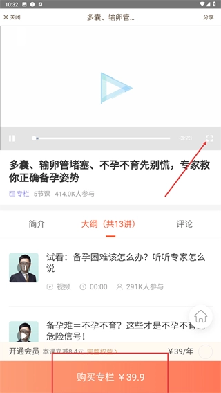 在课程详情页面,你可以查看课程大纲,点击后能放大播放视频;要是想获取完整内容,点击【购买专栏¥39.9】并完成支付即可。