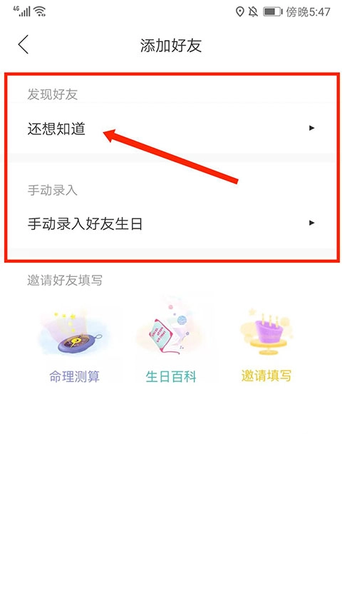 添加信息页设有发现好友和手动录入两个选项,点击即可添加你想了解的好友信息。