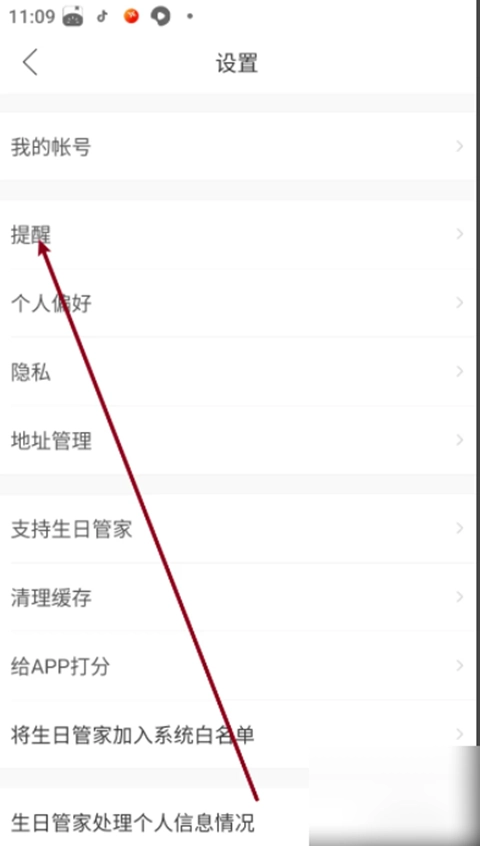 第一步:打开生日管家应用程序,在用户界面中找到并点击设置选项,随后进入提醒项的设置界面。