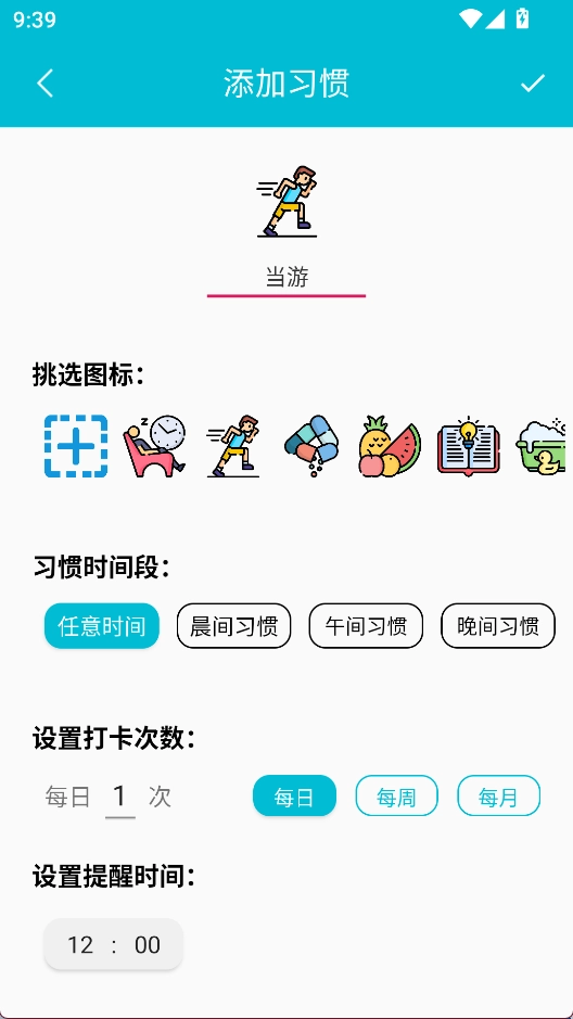 你能够自定义专属于自己的个性习惯,涵盖习惯名称、图标样式、习惯时间、打卡频次、提醒时刻以及备注信息。点击屏幕右上角的“√”按钮,就能完成编辑操作,从而添加新的习惯。