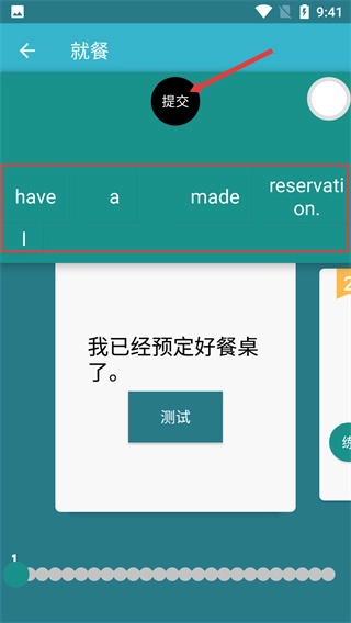 在单词排序的练习界面里,把单词按照正确的顺序排列好之后,点击【提交】按钮,就能完成这个句子的口语练习任务了。