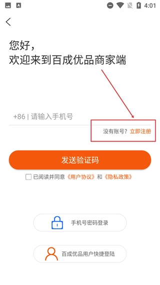 进入百成优品商家端后,选择对应的登录类型,比如【普通商家】适用于线上或线下场景,点击该类型就能进入登录页面。