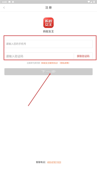 注册时,先在【请输入您的手机号】处填写号码,接着点击【获取验证码】并输入收到的验证码,之后点击【下一步】就能继续注册流程了。
