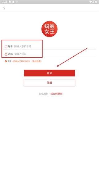 进入登录页面后,在【请输入手机号码】和【请输入密码】的输入框中填写对应信息,勾选相关协议后点击【登录】按钮,即可完成登录操作。