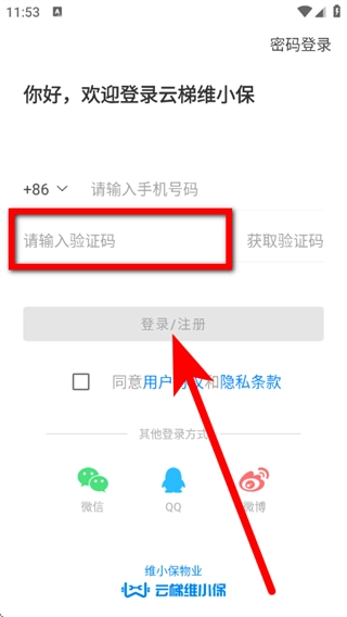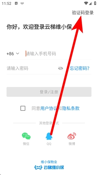 在维小保的欢迎页面,点击底部的登录注册按钮,即可进入登录页面。