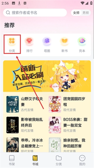 在书城页面点击顶部的【分类】选项,进入书籍分类页面后,就能够按照类别来筛选书籍。