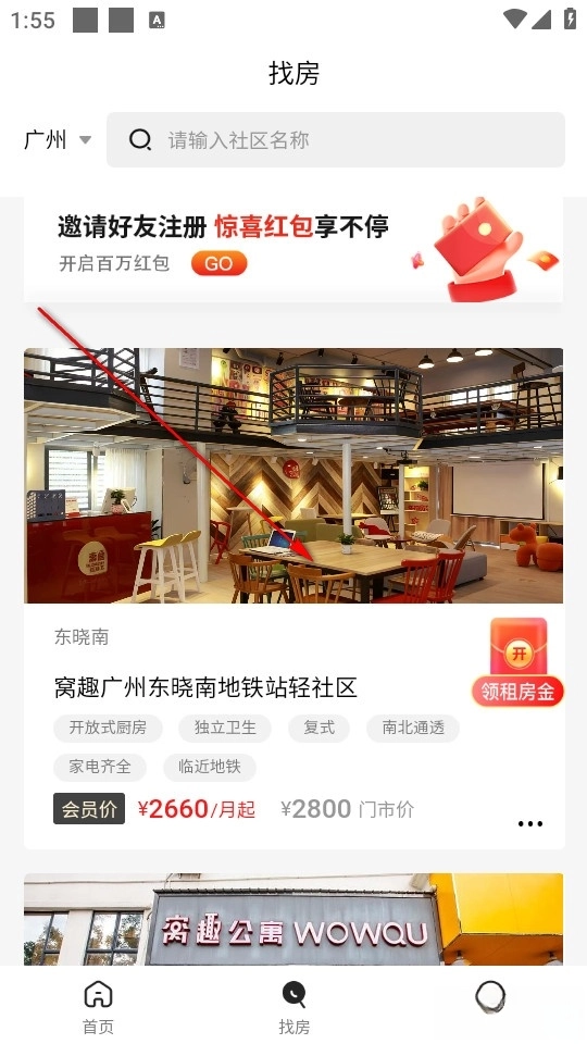 点击软件进入主页后,我们既可以通过地理位置和社区名称搜索相关房源信息,也能直接点击下方的找房图标来进行找房操作。