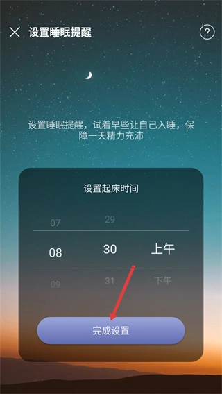 在睡眠提醒设置页面,确定起床时间后,点击“完成设置”按钮来确认相关配置。
