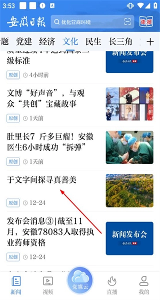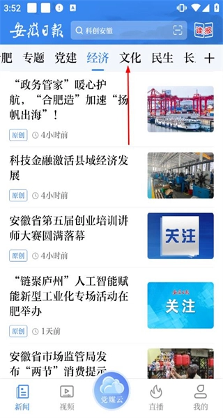 打开安徽日报软件的首页后,能看到政务管家等资讯内容,接着点击顶部的文化选项,就可以切换到文化类资讯页面。