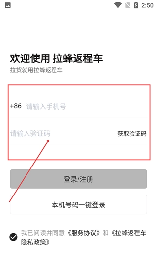 在拉蜂返程车的登录页面,用户既可以通过填写手机号并获取验证码的方式完成登录或注册操作,也能够选择“本机号码一键登录”这一便捷选项。