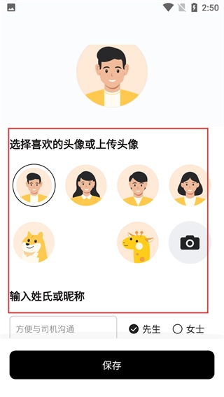 登录后进入个人信息完善页面,可选择系统提供的头像或上传自定义头像,填写姓氏/昵称并选择性别,点击“保存”按钮即可完成信息配置。