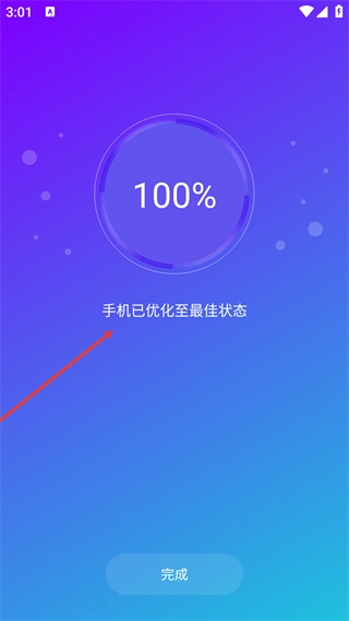 加速结束后,页面会显示“手机已优化至最佳状态”的提示,点击【完成】按钮就能回到功能页面,至此本次手机加速操作就完成了。