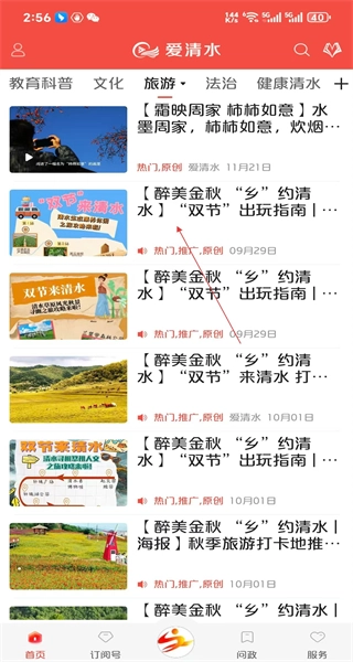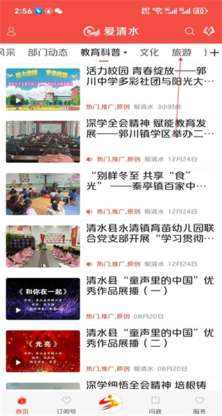 打开爱清水软件的首页后,能看到包含教育科普在内的各类分类栏,接着点击旅游选项,即可切换至旅游类资讯页面。