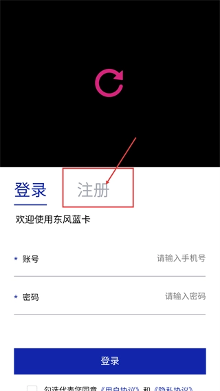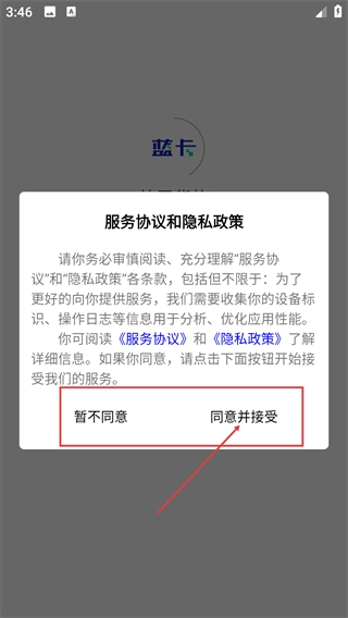启动东风蓝卡应用后,页面会弹出《服务协议和隐私政策》的提示窗口。在仔细阅读相关内容后,点击【同意并接受】按钮,即可进入登录页面。