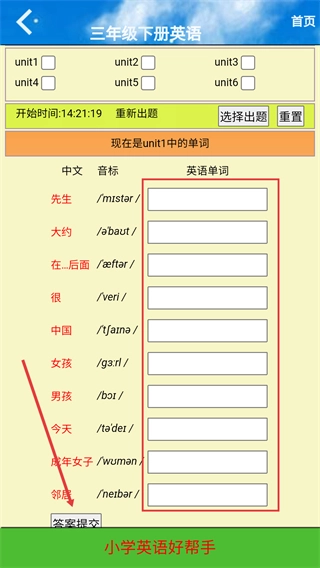 生成题目后,界面会呈现【unit1】单词对应的中文释义与音标,需要在“英语单词”输入栏中填写对应的答案,全部完成后即可提交作答。