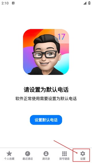 要正常使用这款电话类应用的功能,需先点击【设置默认电话】完成默认电话配置;后续若需调整,可通过底部的【设置】进入配置页面。