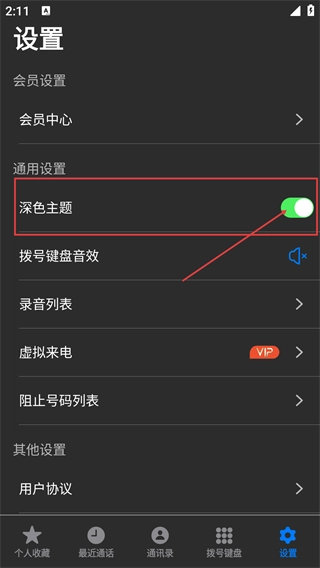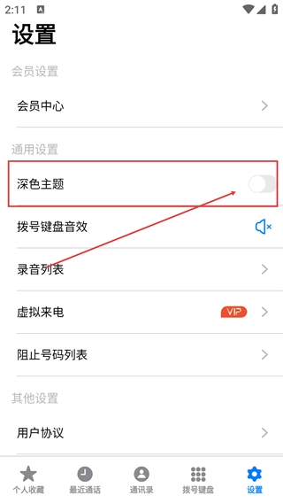 进入【设置】页面后,在通用设置区域找到【深色主题】的开关,此开关可用来控制应用显示主题的风格。