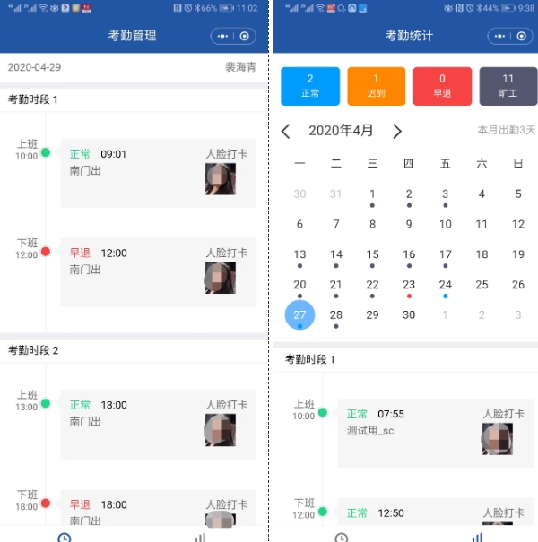 进入考勤管理页面后,能够查看今日的人脸打卡记录。进入个人考勤统计页,可查看当月的考勤数据,涵盖出勤天数,以及正常、迟到、早退、旷工次数。系统默认展示当天的考勤记录,还可以在日历中选择任意一天来查看该日的考勤记录。