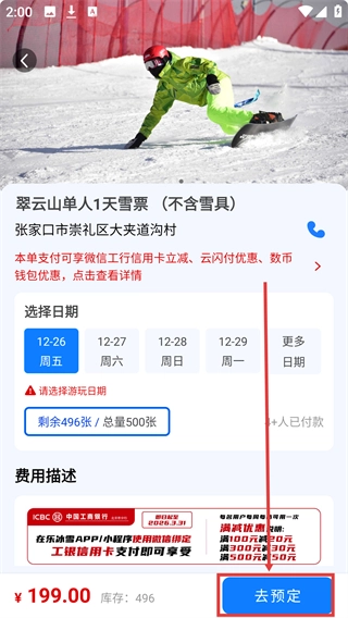 在【翠云山银河滑雪场】页面,挑选票种并查看相应的详情信息。