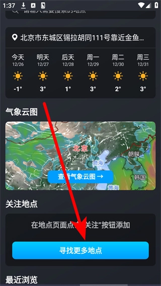 打开新知卫星云图,在首页找到“寻找更多地点”并点击,即可进入地点搜索界面。