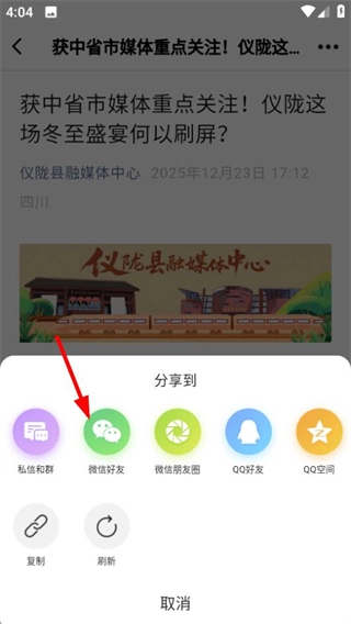 在分享菜单里选定想要的分享渠道,就能把这条新闻内容分享出去了。
