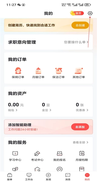 打开软件后,进入个人中心页面,能看到求职意向管理等板块,点击右上角的设置按钮即可进入对应的设置页面。