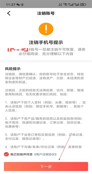 进入账号注销页面,查看手机号注销提示与风险告知,勾选相关协议后点击下一步推进操作。