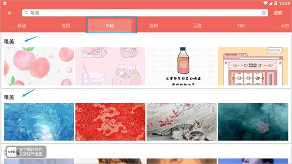 在搜索图片时,可连接优质、专辑、搜狗、百度、360、必应这六个模块。