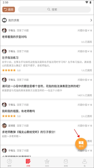从【动态】界面切换到【求教】页面,然后点击右侧的“提问”功能。