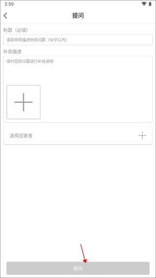 首先输入标题与问题内容,接着上传相关照片,然后挑选合适的回答者(可以是老师或网友),完成这些步骤后,点击页面下方的“提问”按钮,就能成功提交问题了。