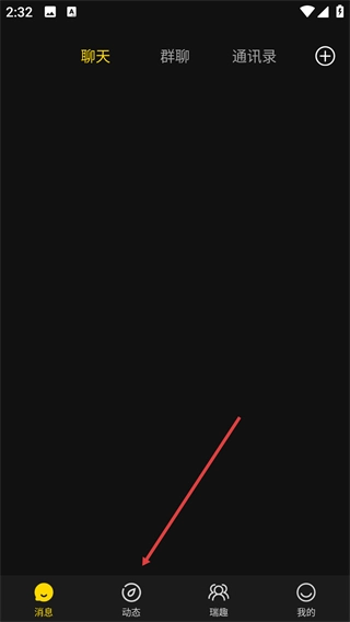 在社交类应用的消息页面,点击底部导航栏的“动态”选项,就能切换到动态内容展示页面,这个页面里还设有群聊、通讯录等功能的入口。