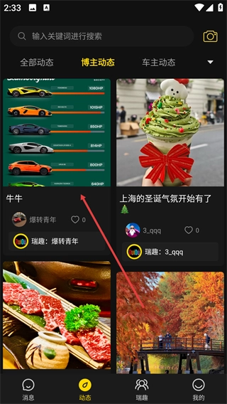 在博主动态页面,点击目标动态内容,就能进入该动态的详情页,查看发布者的相关信息以及内容的具体细节,此外页面上还设有车主动态等分类标签。