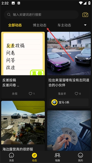 进入动态页面后,系统默认呈现“全部动态”内容。若需查看博主发布的内容,可点击“博主动态”标签进行切换。此外,该页面还具备关键词搜索和内容发布功能。