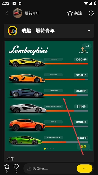 进入动态详情页面后,能够查看发布者“爆转青年”分享的内容(例如兰博基尼车型的马力图),同时可以对该发布者进行关注操作,也能对这条动态执行点赞或评论的互动。